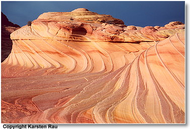 Ganz anders das Bild oben. Wer nun denkt, dieses sei an einem anderen Tag aufgenommen worden, irrt. Gleicher Tag, nur zwei Stunden später! Des Rätsels Lösung ist (wie so oft) das Warten auf die Golden Hour. Die Second Wave ist nämlich der Inbegriff einer Sunset- Location, denn nur die tief stehende Sonne kann dem blassen Navajo Sandstone ein solch intensives Farbenspiel entlocken! Alle meine Fotos auf diesen Seiten, wie natürlich auch alle Profi-Fotos der Second Wave, sind innerhalb der letzten Stunde vor Sonnenuntergang aufgenommen worden. Je nach Zeitpunkt ändern sich die Farben nochmals enorm. Während zu Beginn der Golden Hour der Sandstein eher einen rosa Farbton bekommt, sind die Fotos kurz vor Sonnenuntergang wesentlich kontrastreicher und eher rot- bzw. gelblastig.